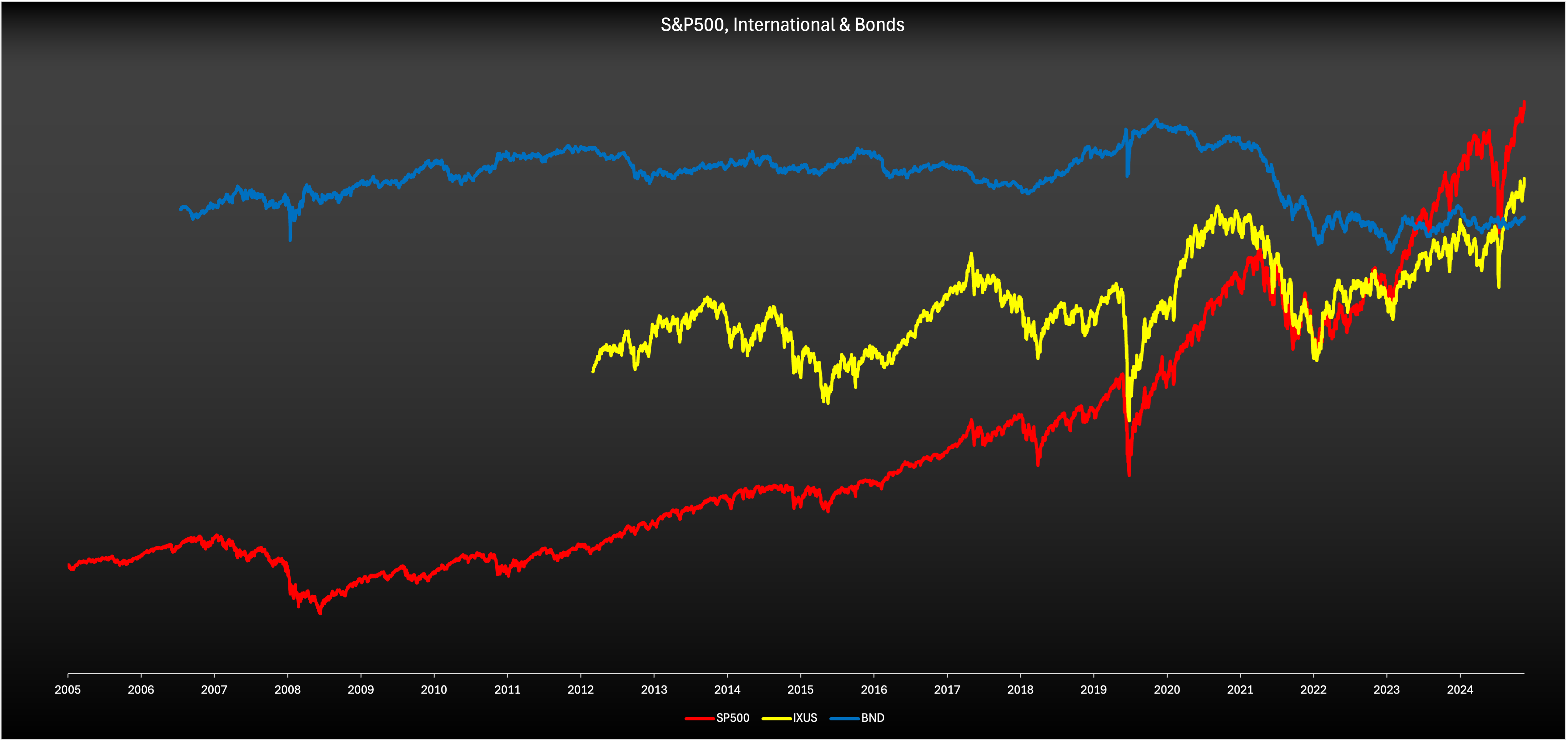 - BND (Total Bond Market): annualized returns roughly 2-3% range over 15 years